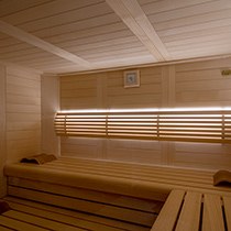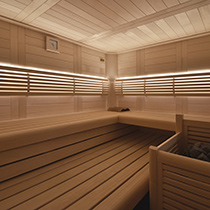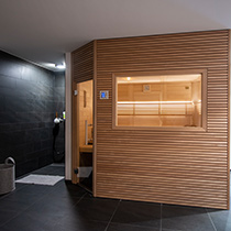 Eine großzügige Saunakabine mit Eckeinstieg und angrenzender Dusche in einem eigens dafür vorgesehenem Raum im Untergeschoß. Ausgestattet mit indirekter Beleuchtung hinter den Rückenlehnen, einem großen Fenster in der Front sowie einer Außenverkleidung mit Hemlock-Profilleisten.