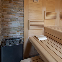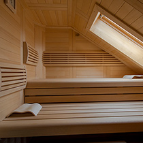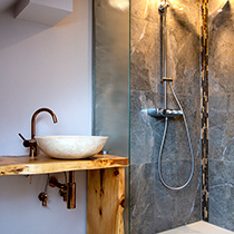 Die Grundfläche unter der Dachschräge wurde optimal genutzt. Sowohl Dachschräge als auch das vorhandene Dachfenster wurden berücksichtigt und entsprechend eingepasst, die Wandfläche hinter dem Ofen mit Steinriemchen verkleidet. Astiges Zirbenholz ziert die äußere Frontseite. Vis-à-vis der Saunakabine eine Dusche und ein Waschtisch – aus massiver Zirbe gefertigt.