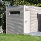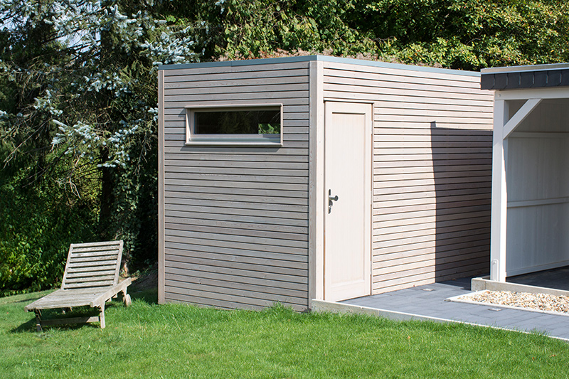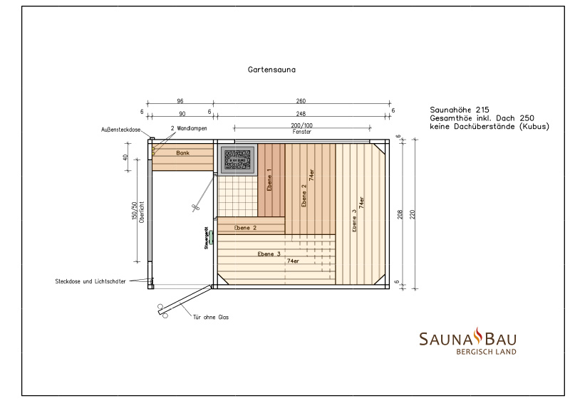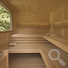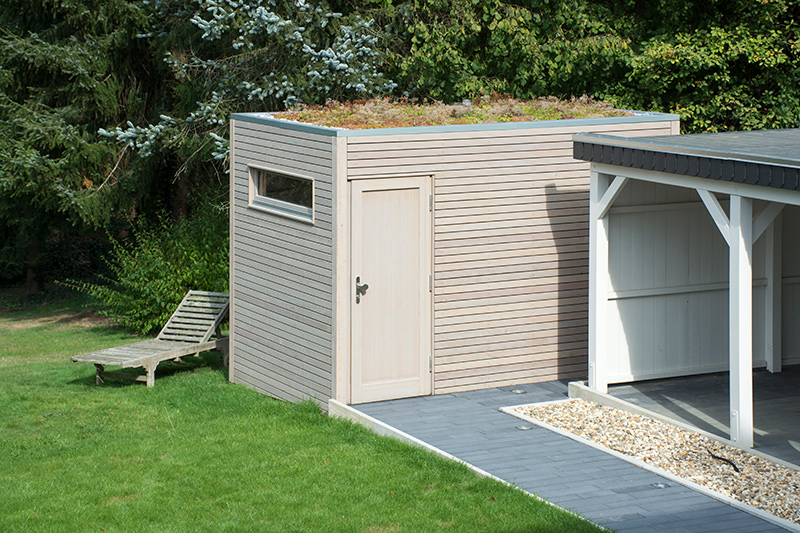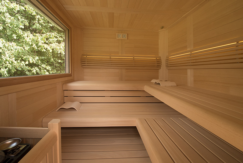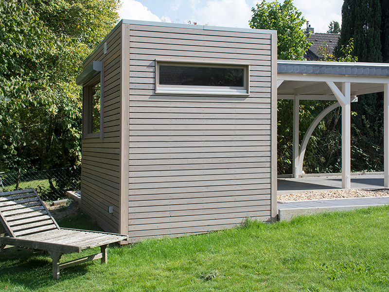 Eine Gartensauna mit großem Innenraum auf klassischem Grundriss.
