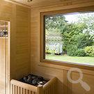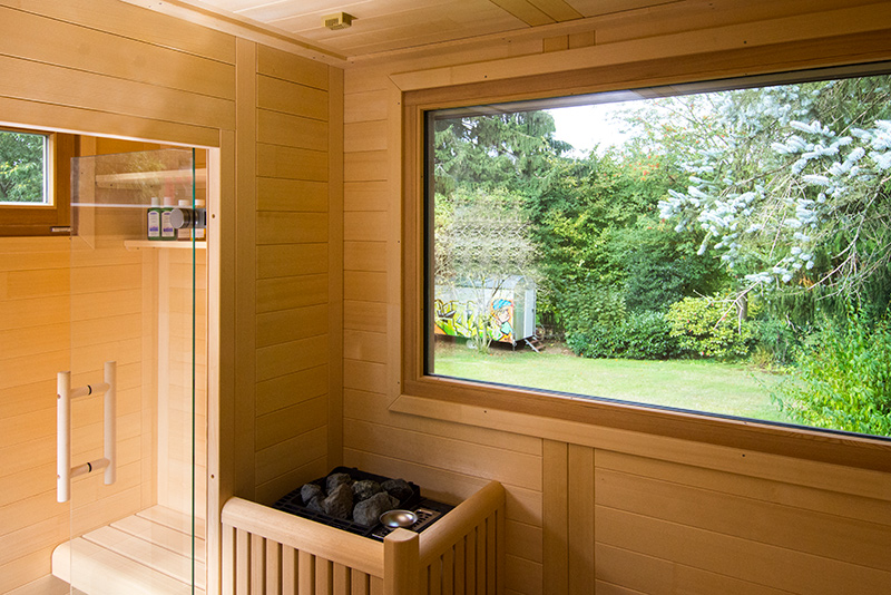 Das Saunafenster mit elektrischem Sichtschutzrollo gibt den Blick in den Garten frei. Für Licht und Belüftung erhielt der Vorraum ein Oberlicht mit Kippfunktion.