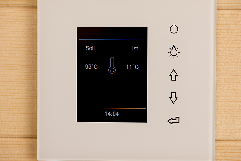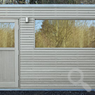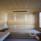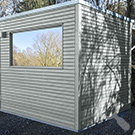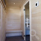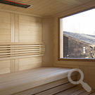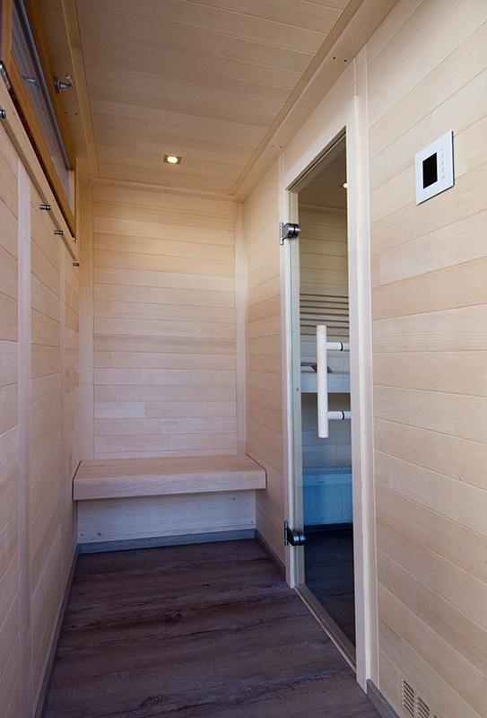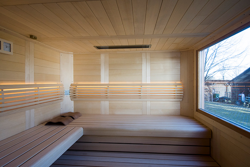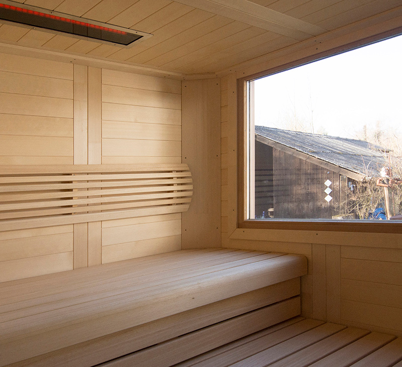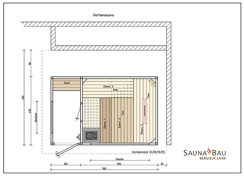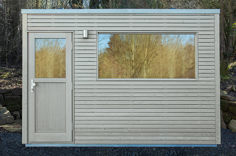 Das Saunahaus steht auf einer neu geschaffenen Fläche, der Hang wurde mit einer Bruchsteinmauer abgefangen. Auch hier gibt ein großes Fenster den Blick in den Garten frei, das Oberlicht mit Kippvorrichtung sorgt für gute Belüftung und Tageslicht.