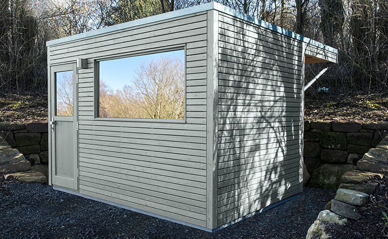 Das Pultdach hat einen großen Dachüberstand nach hinten (für Brennholzeinlagerung)