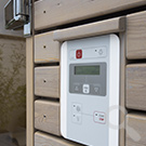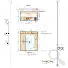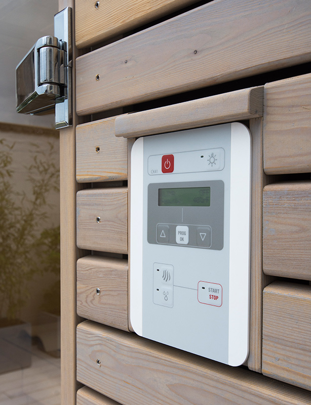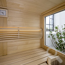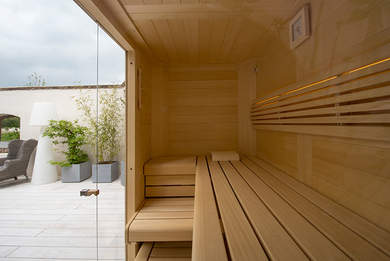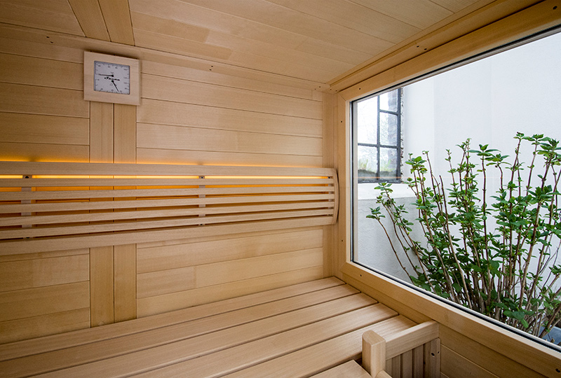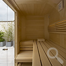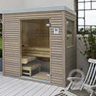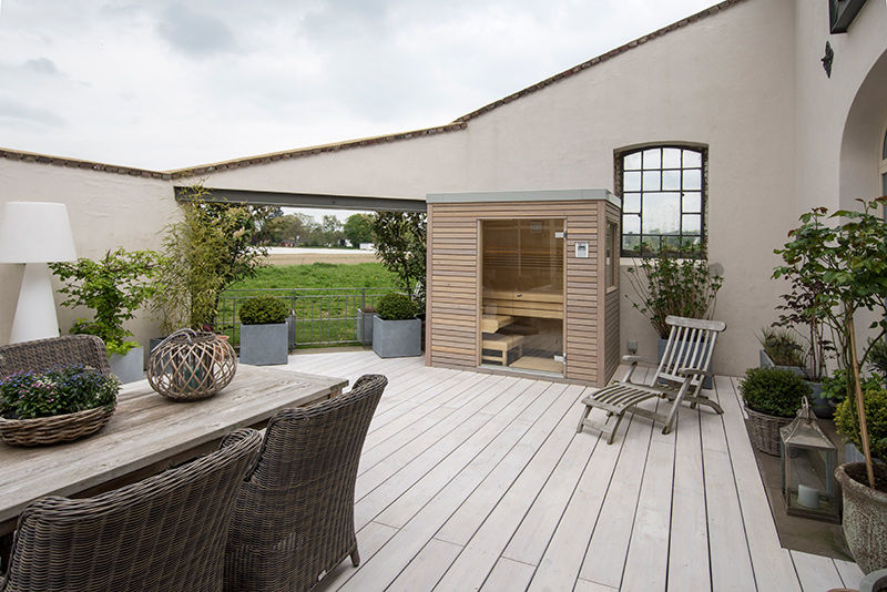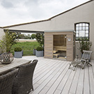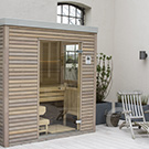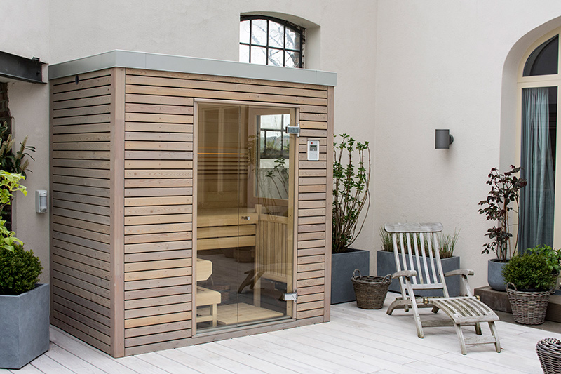In einem großen, offenen Innenhof hat diese freistehende Außensauna ihren Platz gefunden.