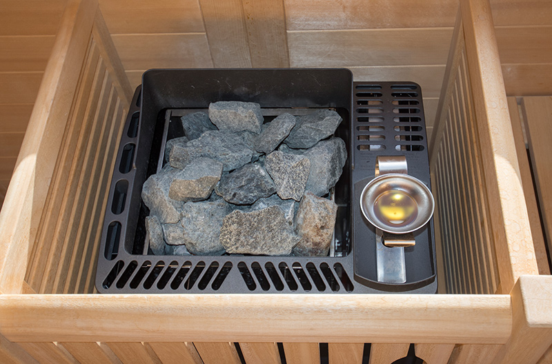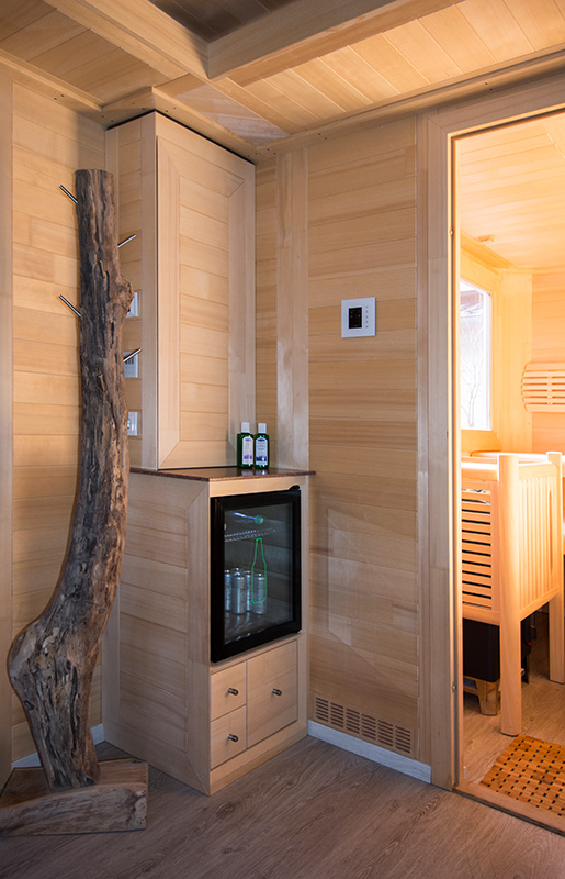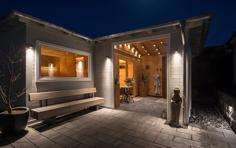 Für den Oberboden von Sauna und Ruheraum wurde ein Klick-Vinyl gewählt, für den Vorraum Steinplatten und Fliesen. Das Satteldach ist mit Schindeln gedeckt, die Außenflächen der Blockbohle erhielten einen wetterfesten Anstrich in grau. Vor dem Saunahaus noch das Unikat einer Bank aus Iroko (Kambala) Holz.