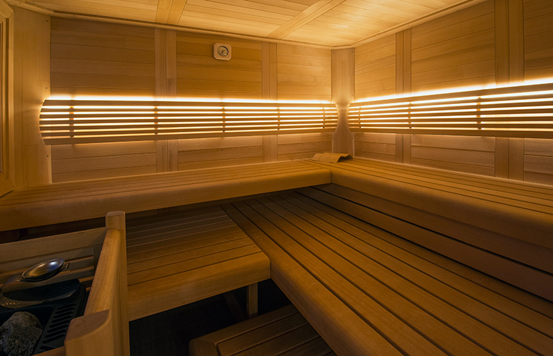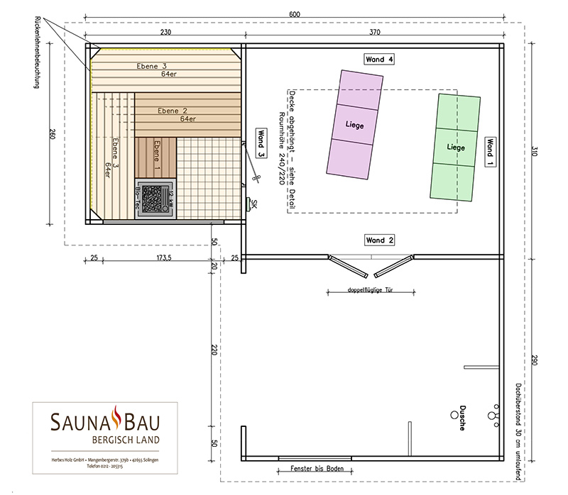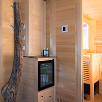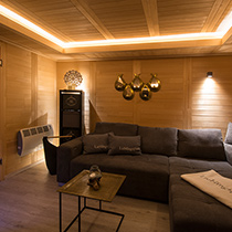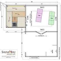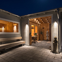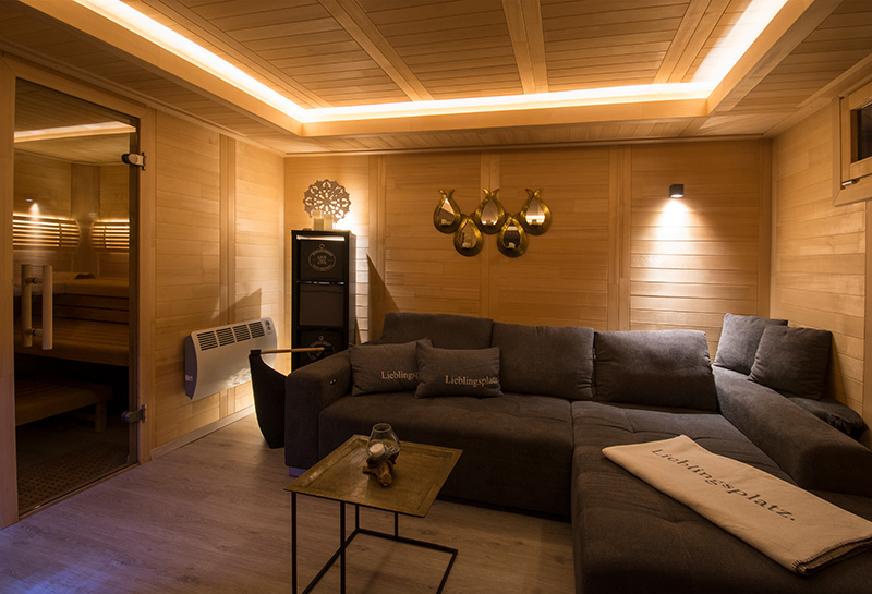 Diese Gartensauna ist die bislang größte, von uns gebaute Saunaanlage für den Außenbereich. Neben der großen Saunakabine verfügt sie über einen gemütlichen Ruheraum mit Stufendecke und indirekter LED Beleuchtung. Technik und Steuerung für den Klima-Saunaofen und das Licht sind in einem separaten Schrank untergebracht, der auch noch Platz für die Minibar bietet.