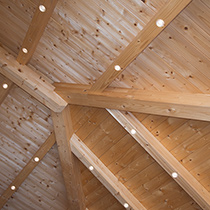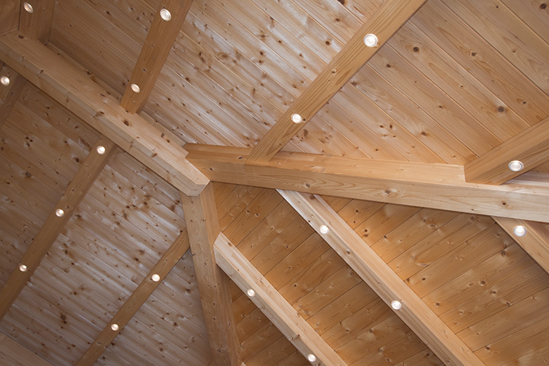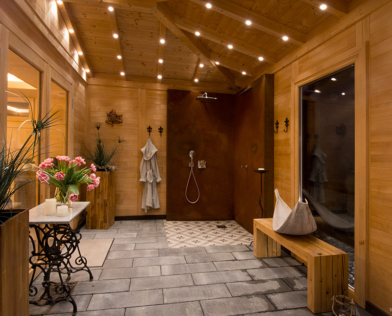 Der zum Garten offene Vorraum mit Dusche verfügt zudem über ein großes, bodenhohes Fenster zum Garten. Für die Beleuchtung sind LED Strahler in die Balkenkonstruktion der Decke eingelassen. Cortenstahl ist das Material der Wandflächen im Bereich der Dusche.