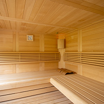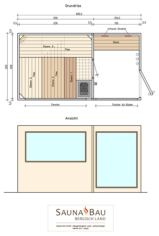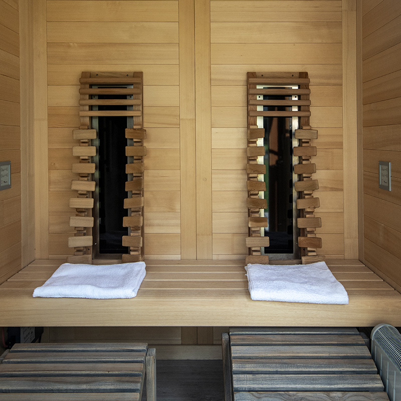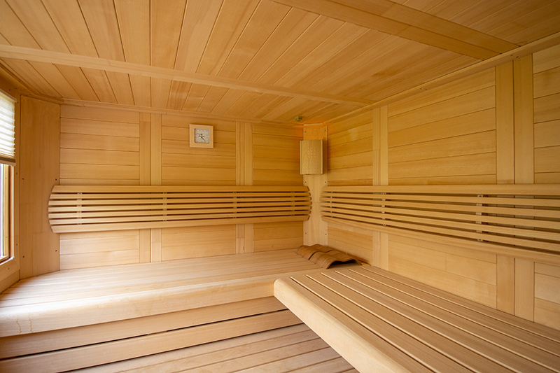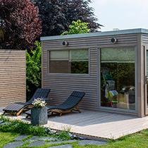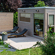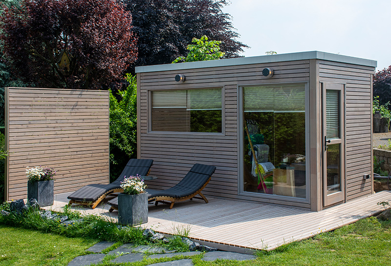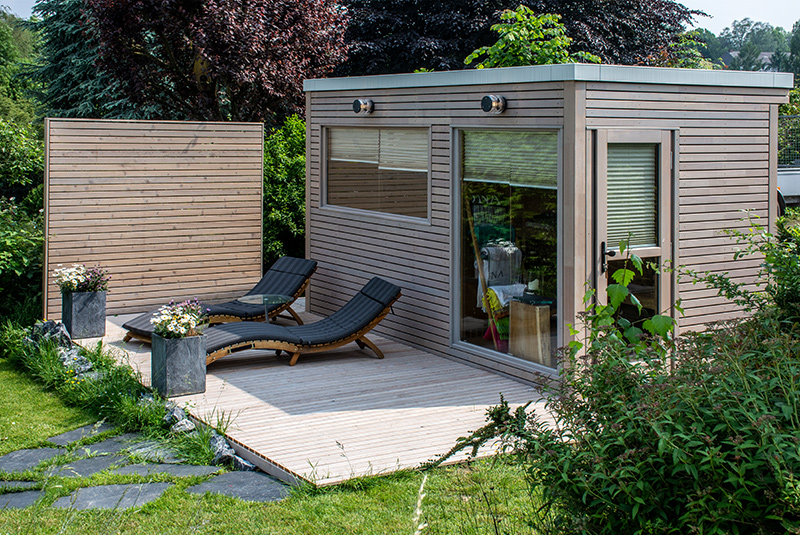 Eine Gartensauna in klarer kubischer Form. Große Fenster, sowohl in der Saunakabine als auch im Vorraum. In die Wand des Vorraums sind zwei IR Strahler eingelassen, an der Wand aufgesetzt die beiden flexiblen Rückenlehnen.