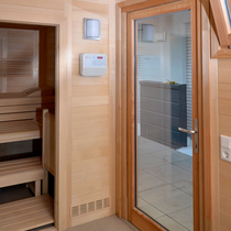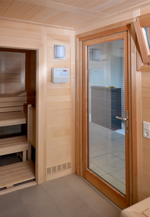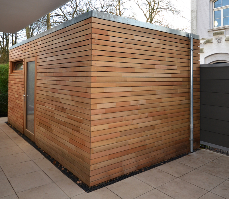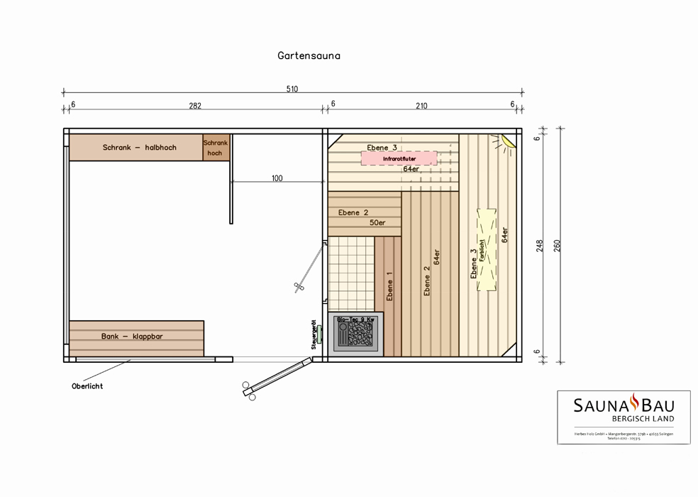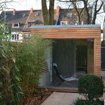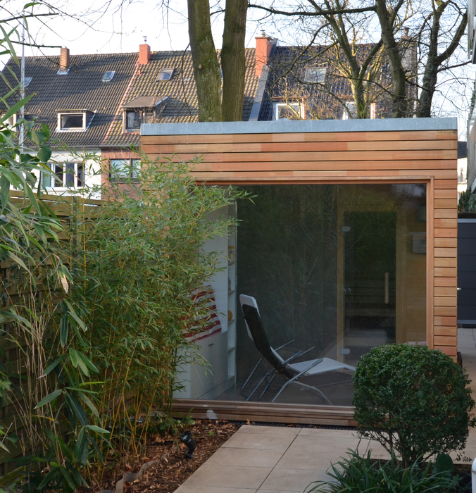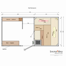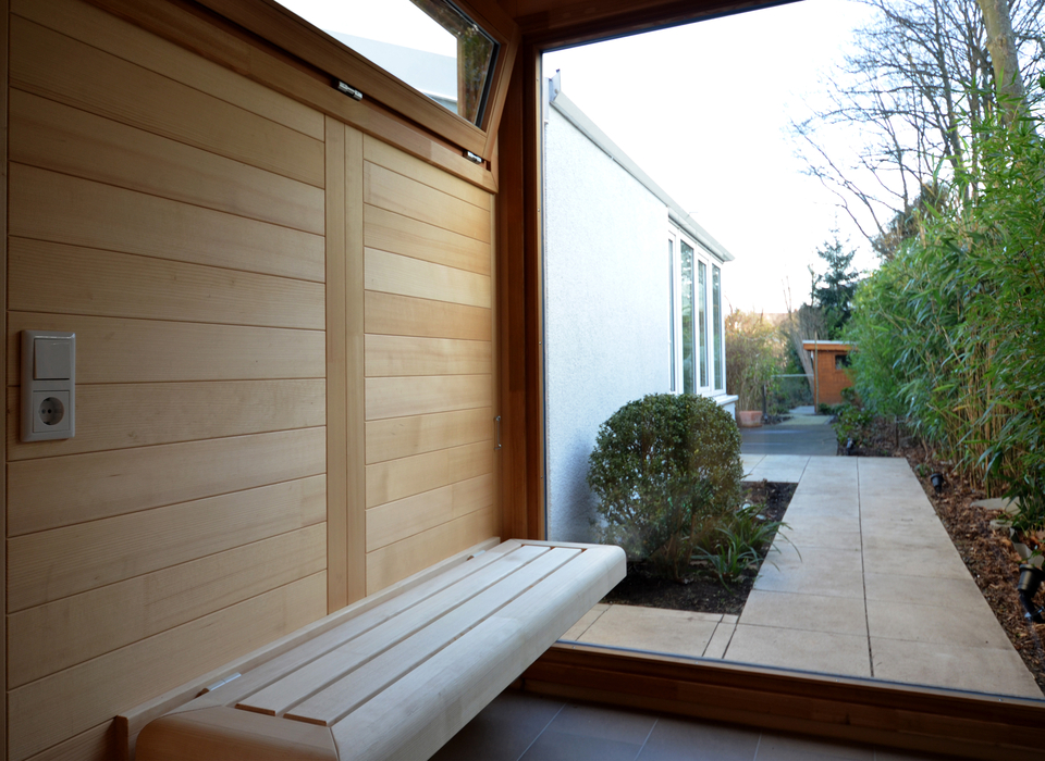 Auch diese Gartensauna wartet mit einem klassischen Grundriss auf.