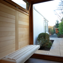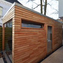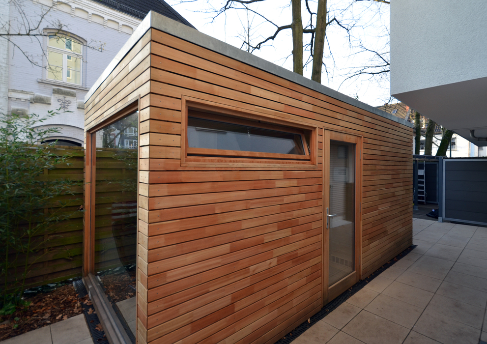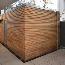 Lärchenleisten in Rhombusform verkleidet. Das Saunahaus hat