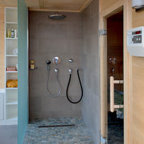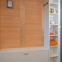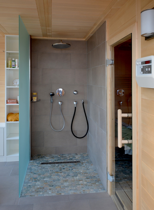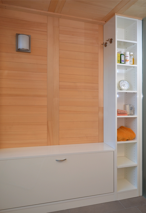 Neben einer Dusche wurden ein offenes Regal, ein Technikschrank sowie