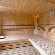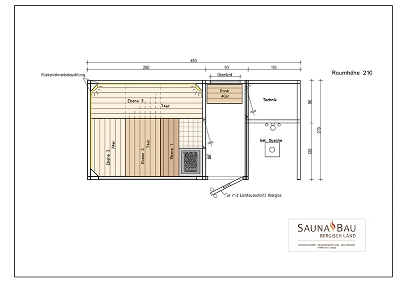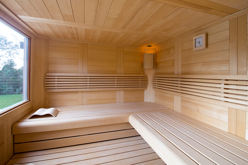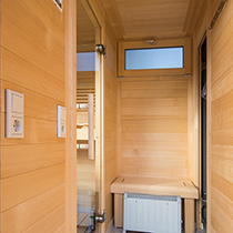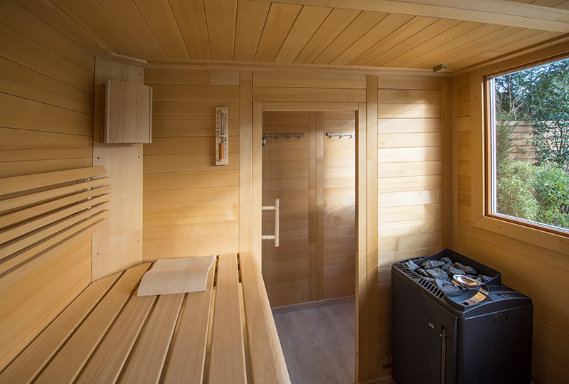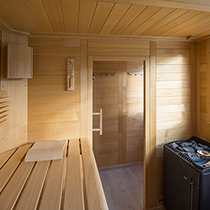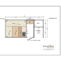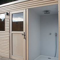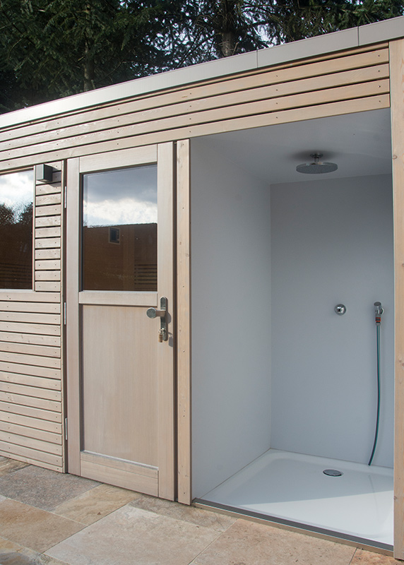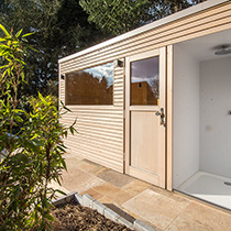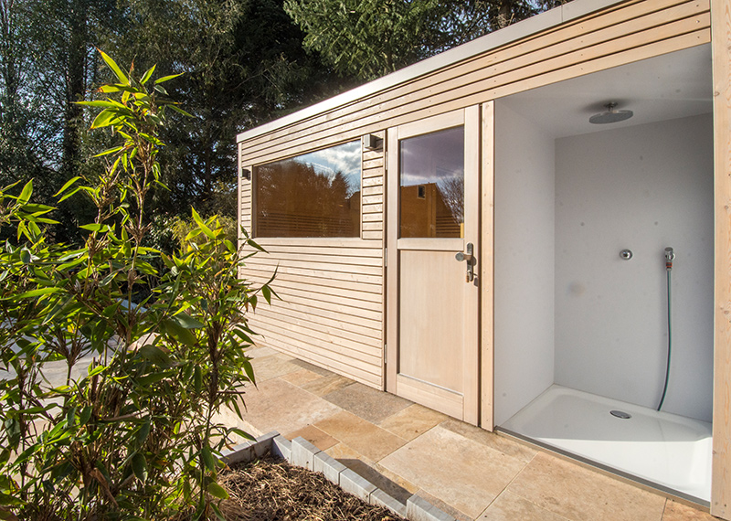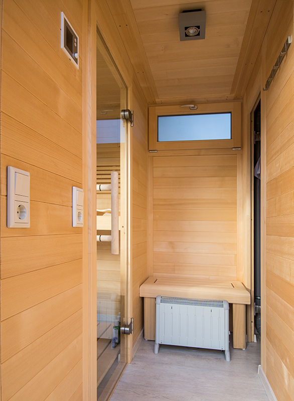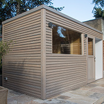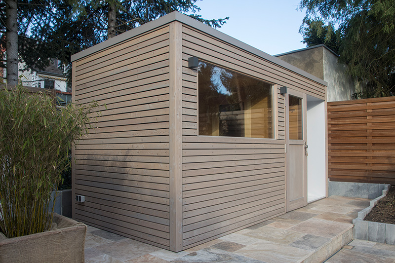 Das geräumige Gartenhaus bietet neben einer großen Saunakabine auch Platz für einen Vorraum mit Bank, einem separaten Technikbereich sowie einer von außen begehbaren Dusche. Zum Standard gehört der vollverzinkte und isolierte Bodenrahmen. Das Flachdach ist mit Folie gedeckt und verfügt über farbige Alublenden. Für die Außenverkleidung wurden vorgegraute Rhombusleisten aus Lärchenholz gewählt.