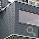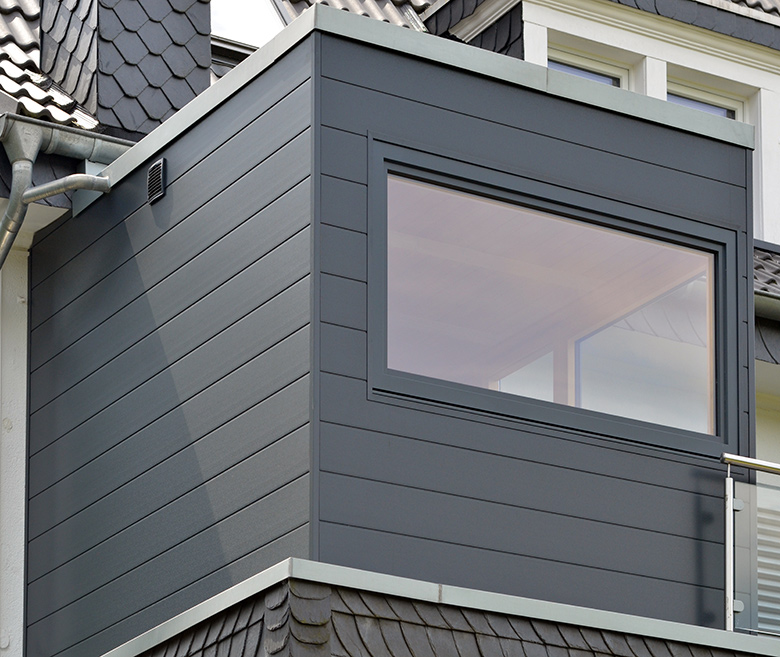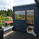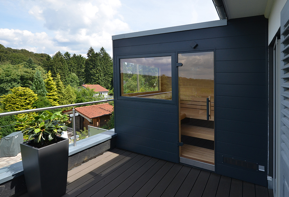 Die Sauna in Kubusform erhielt ein Flachdach ohne Überstände, die erforderliche Dachneigung verbirgt sich hinter der Attika. Als Außenverkleidung wurde eine pflegeleichte Kunststoff-Paneele gewählt.