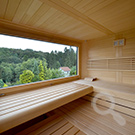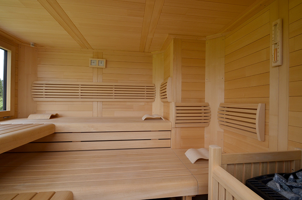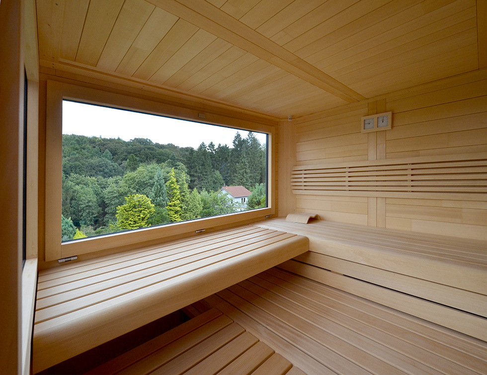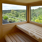 tritt man auf den Balkon mit direktem Zugang zur Sauna. Durch zwei große Fenster genießt man die tolle Aussicht, eins lässt sich zu Reinigungszwecken vollständig öffnen. Der Grundriss der Kabine zeigt eine Eckaussparung für den vorhandenen Kamin. Technisch ist die Sauna mit LED-Rückenlehnen-Beleuchtung und einem Klimaofen ausgestattet.