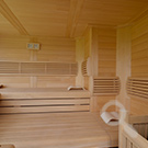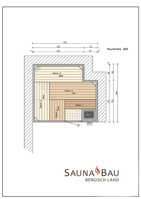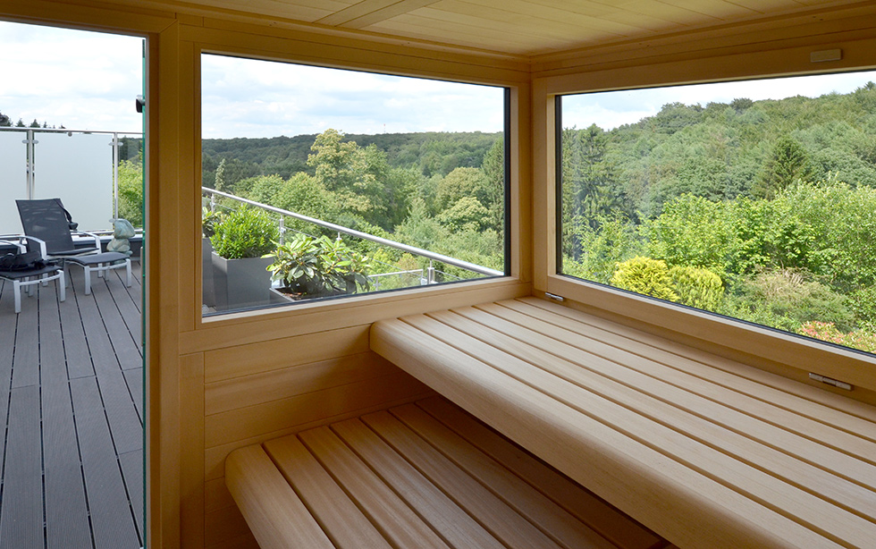 Die Saunakabine wurde für einen großen Balkon geplant. Aus dem angrenzenden Bad