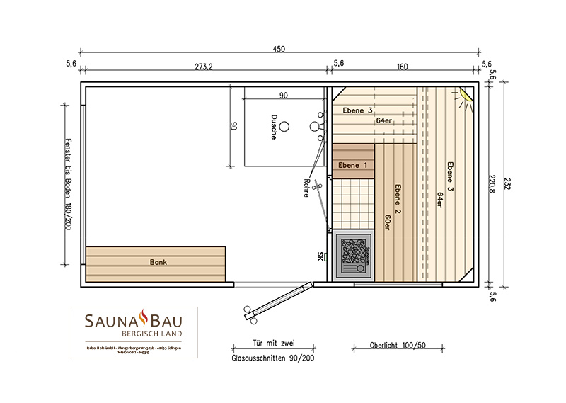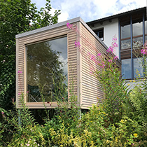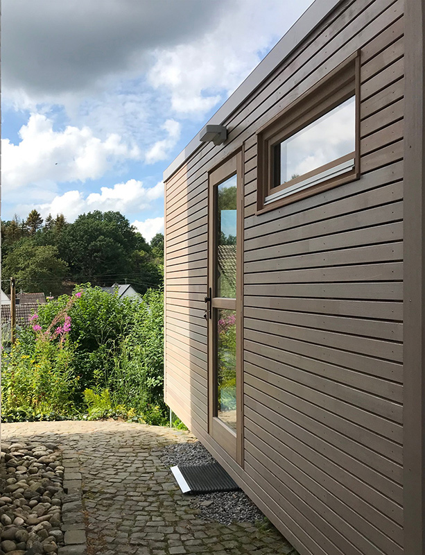 Trotz Hanglage wurde eine Lösung für ein geräumiges Saunahaus mit Vorraum gefunden.