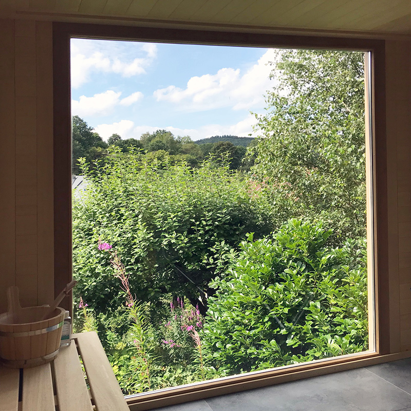 Die Saunakabine verfügt über ein Oberlicht, der Ruheraum über ein bodenhohes Fenster zum Garten.