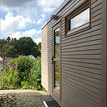 Dusche und eine große Bank finden sich im Ruheraum. Grau behandelte Lärchen-Rhombusleisten verkleiden das Saunahaus.