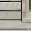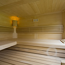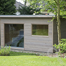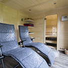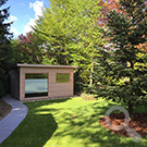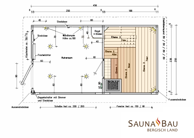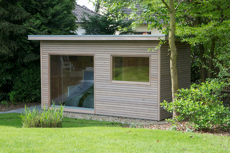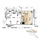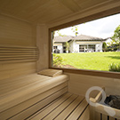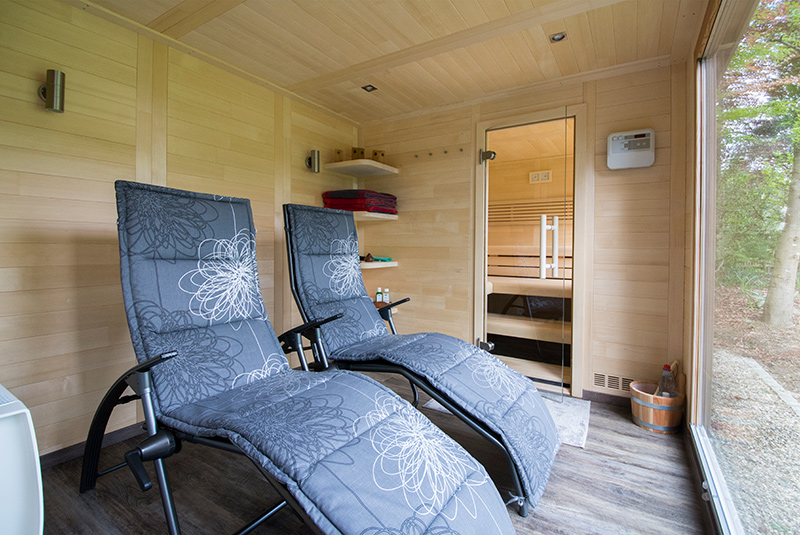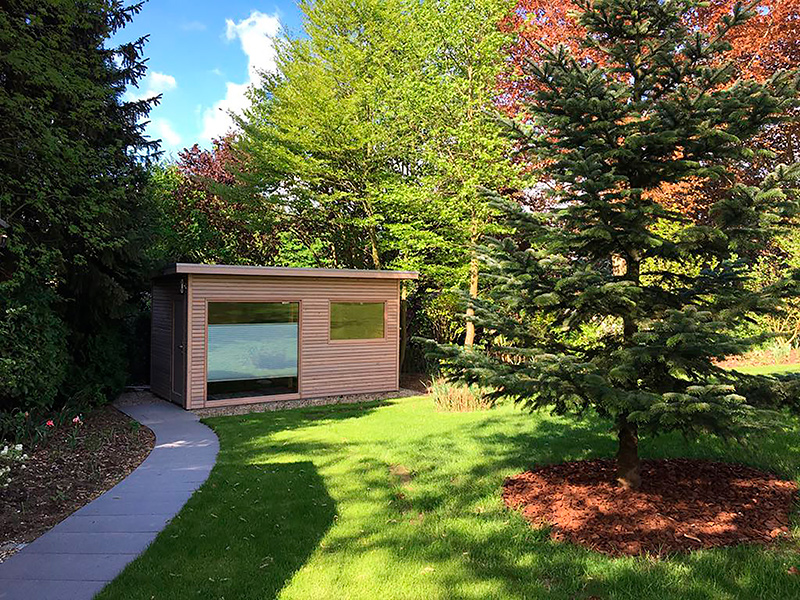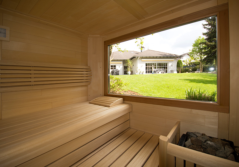 Eine freistehende Gartensauna mit großem Ruheraum, komplett ausgestattet mit Klimaofen, Frostwächter im Vorraum, Beleuchtung mit diversen LED‘s, Eckregal und großflächiger ISO-ESG Verglasung. Das Pultdach hat einen allseitigen Dachüberstand mit Zinkeinfassung.