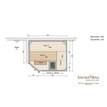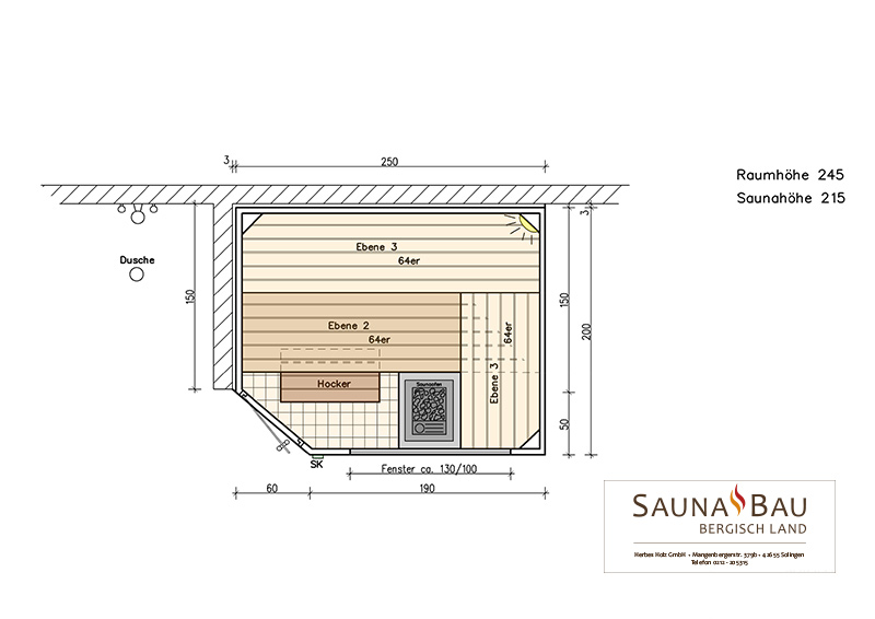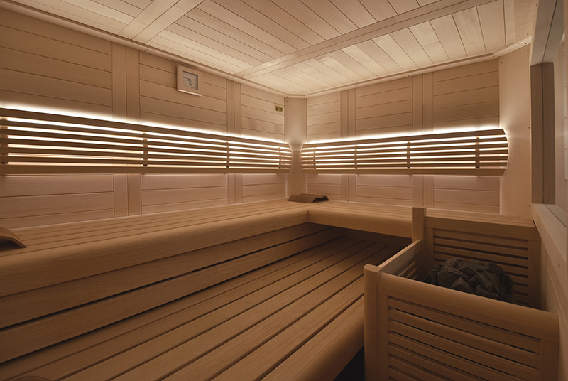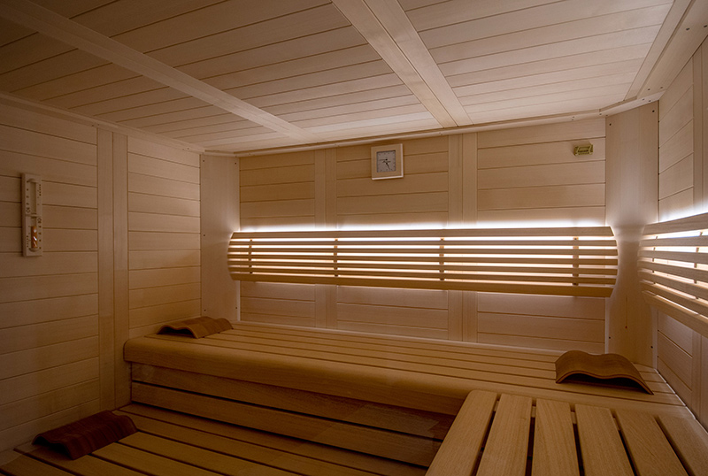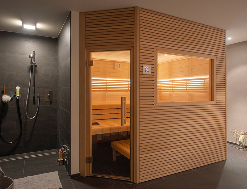 Eine großzügige Saunakabine mit Eckeinstieg und angrenzender Dusche in einem eigens dafür vorgesehenem Raum im Untergeschoß. Ausgestattet mit indirekter Beleuchtung hinter den Rückenlehnen, einem großen Fenster in der Front sowie einer Außenverkleidung mit Hemlock-Profilleisten.