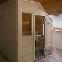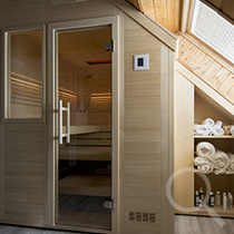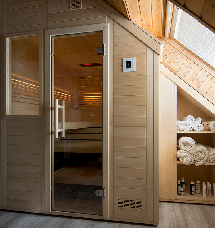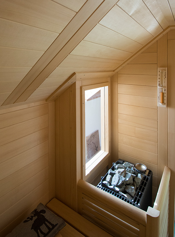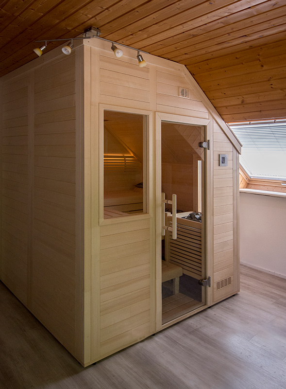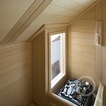 Eine Sauna mit Dachschräge, zusätzlicher Eckaussparung und zwei Fenstern.