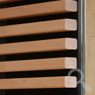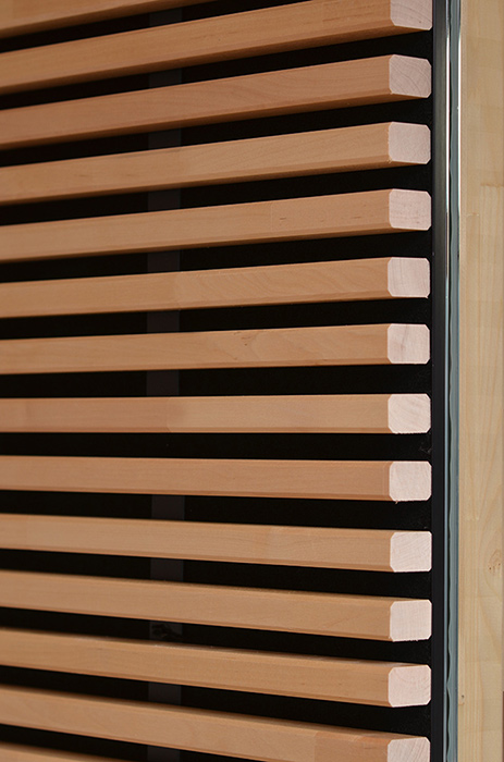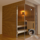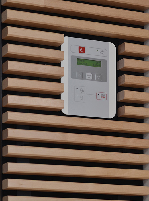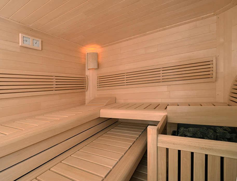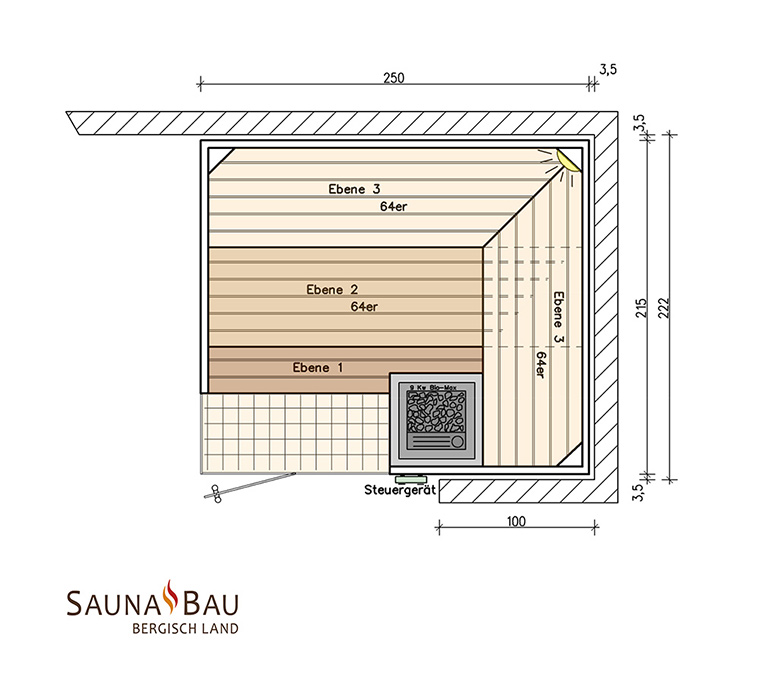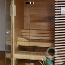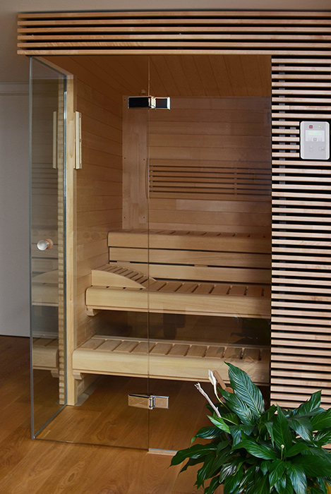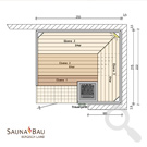Ein klassischer Grundriss, eingepasst in die vorhandene Raumnische. Die Verglasung über eine Ecke lässt die Sauna offen wirken. Ausgestattet mit einer dreistufigen Inneneinrichtung und einem Ofen mit Klimafunktion.