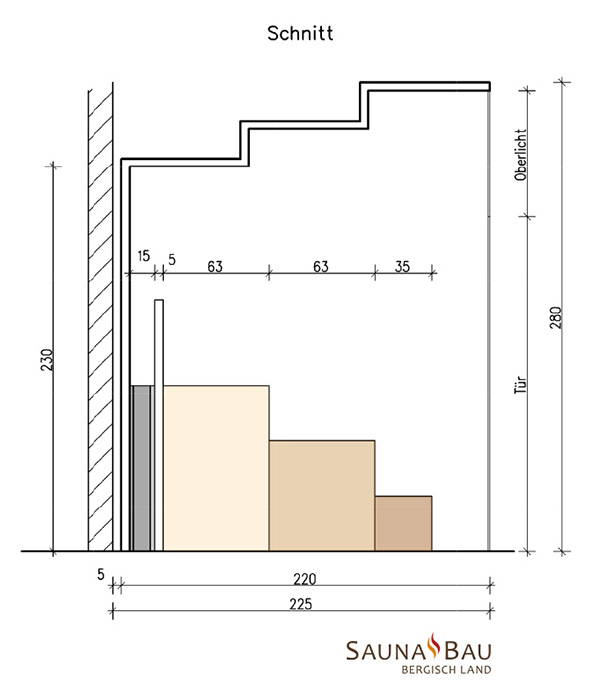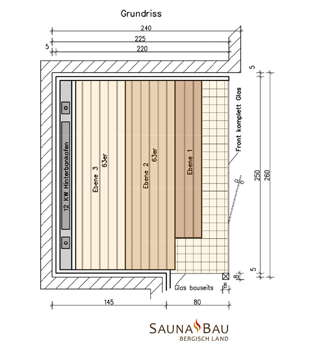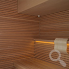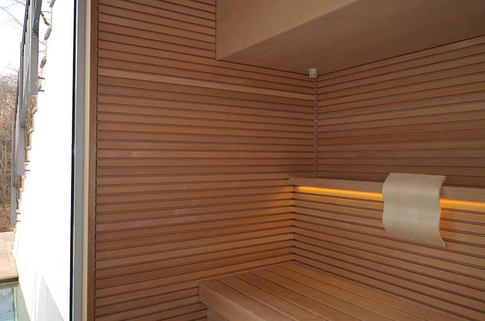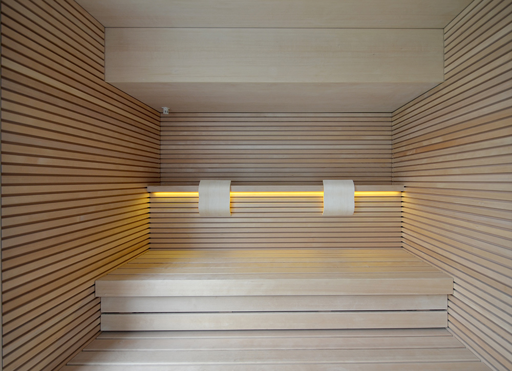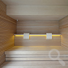 Eine minimalistisch gestaltete Sauna – integriert in einen Wellnessbereich – mit „unsichtbarer“ Technik: der Saunaofen ist hier ein Hinterwandofen mit Softtechnik.