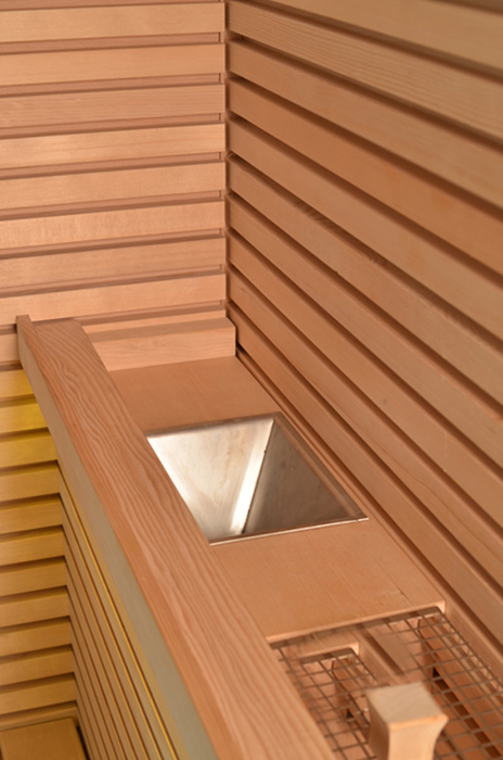 Bei dieser Saunakabine sind auch die Banklatten aus massivem Hemlock gefertigt.