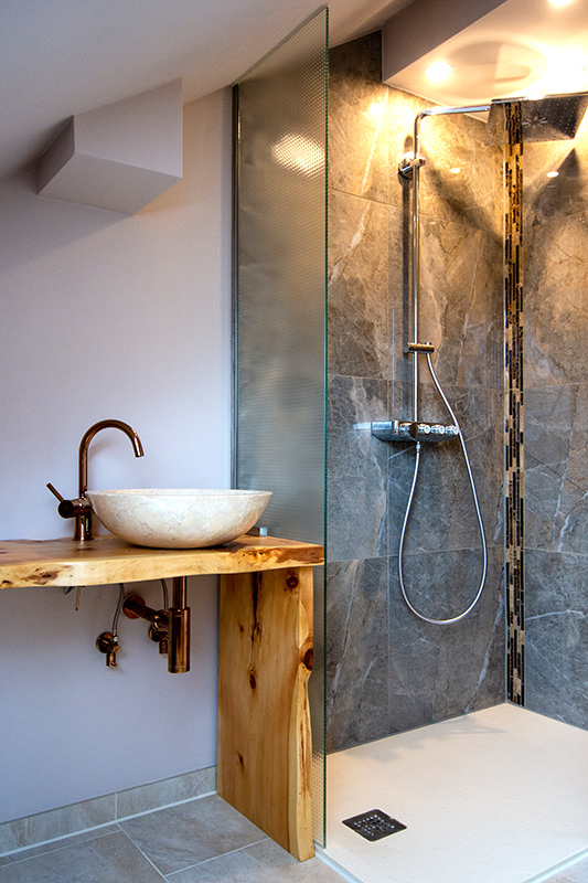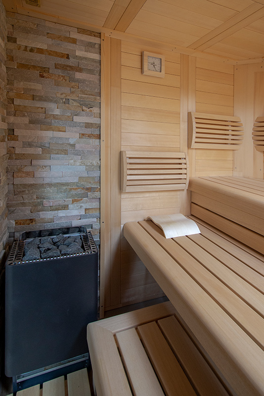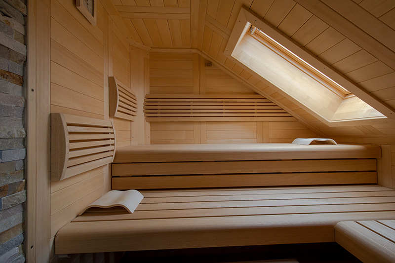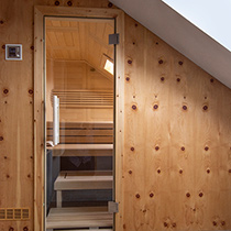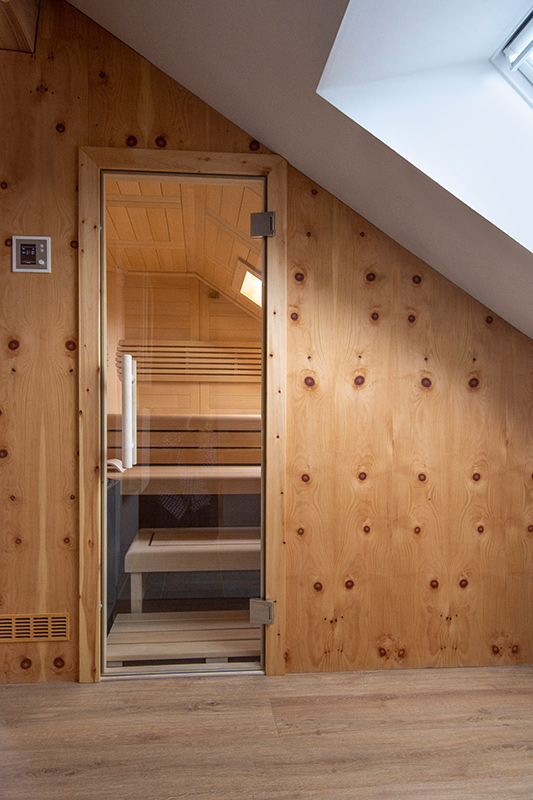 Die Grundfläche unter der Dachschräge wurde optimal genutzt. Sowohl Dachschräge als auch das vorhandene Dachfenster wurden berücksichtigt und entsprechend eingepasst, die Wandfläche hinter dem Ofen mit Steinriemchen verkleidet. Astiges Zirbenholz ziert die äußere Frontseite. Vis-à-vis der Saunakabine eine Dusche und ein Waschtisch – aus massiver Zirbe gefertigt.